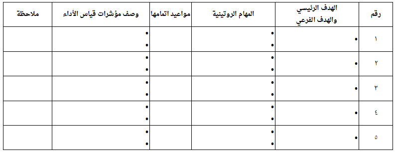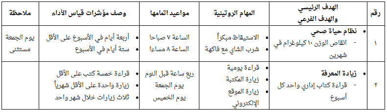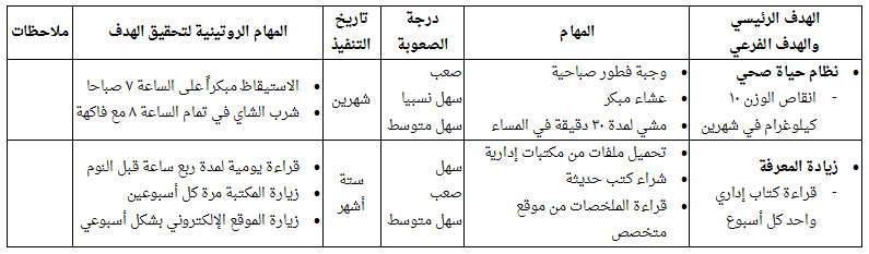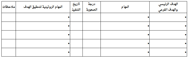 قُم باختيار أحد أصعب المهام لديك أو يمكنك اختراع مهمة غير مرتبطة بأهدافك حالياَ فقط لغايات التمرين، وقُم بتجزئتها لأجزاء بسيطة للعمل عليها حتى توصلك للهدف الأكبر بإستخدام النماذج المرفقه في الاسفل، نموذج المهام العصبة وهناك مثال لتوضيح كيفية العمل عليه ونموذج لمؤشرات قياس الاداء وايضاً هناك مثال يساعدك على استخدام النموذج.